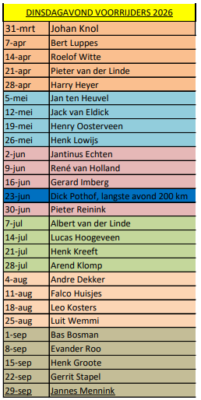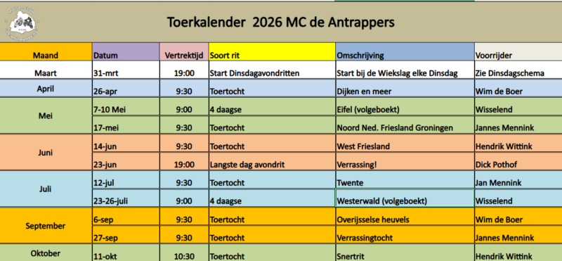 Jaarlijks organiseren we oa: Elke dinsdagavond een toerrit, diverse langere toertochten, een lang weekend Eifel enz. enz.